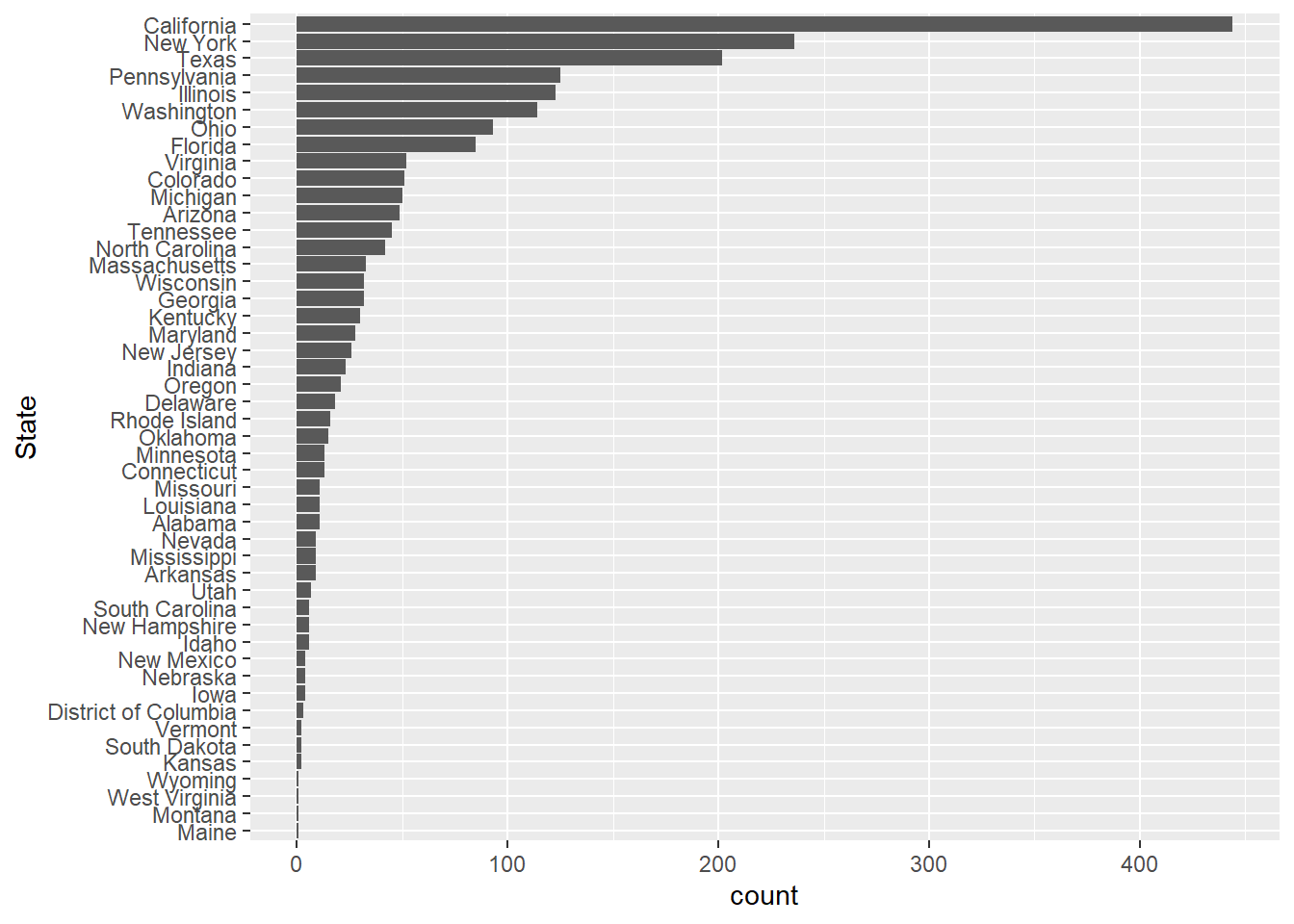 count(State, sort = TRUE)# A tibble: 48 × 2
