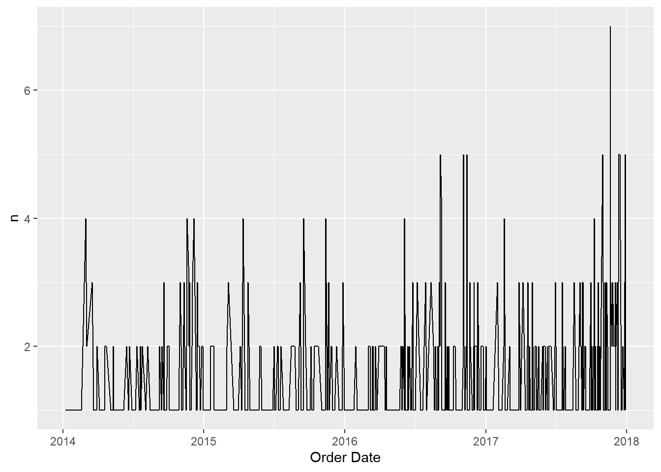 ggplot(aes(x = `Order Date`,y = n)) +